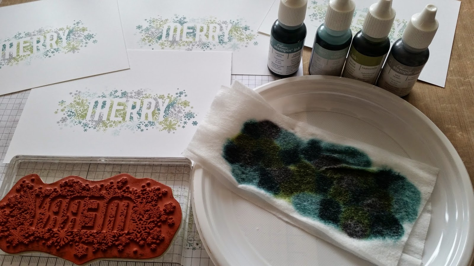 Bij deze techniek maak je gebruik van een babydoekje/snoetenpoetser. Hierop druppel je diverse kleuren inkt uit een re-inker en zo heb je je eigen inkt pad gemaakt. Dit doekje kan je voor meerdere afdrukken gebruiken maar je zal wel merken dat de afdruk lichter zal worden.