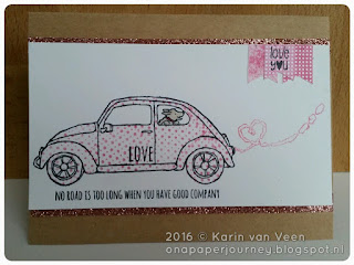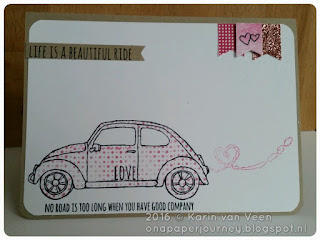 Ik ben aan de slag gegaan met de stempelset Beautiful Ride. Ik vind die kever zo'n leuke auto en zag dat hondje al vrolijk uit het raam hangen.